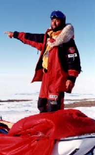 ▼カナダのワードハント鳥に到着。最後の二十数キロは、いたるところに乱氷帯の続く最大の難所だった。「今までで最悪です。雪が重くて思うように歩けません。」と悲痛な声が無線機を通じて届いてきた。到着地のワードハント島からは「日本晴れです。」との元気いっぱいの大場さんの声が届く。 |