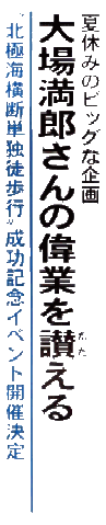| ▼大場満郎さんの「北極海横断成功」を、町あげてお祝いするために、上配の日時・会場にて配念イベントを開催することになりました。町や議会、後援会、満訳地区の代表者らで実行委員会を組織し、現在その準備を進めています。当日は、大場さんと支援事務局の方との対談やソリやテントなど装備品の展示、ミニコンサートなど盛りだくさんの催しを計画しています。また、県内外にも参加を呼びかけ“偉業達成の祭典”にふさわしい内容にしたいと考えています。 イベントの詳しい内容は 役場生涯学習課(電話0233-43-2111) にお問い合わせください。 |