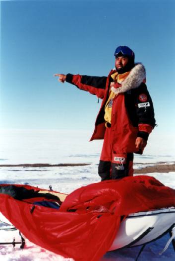 大場 北極点到達までもう少し、という苦しいとき、最上中学校のみなさんから激励のメッセージをいただき、ずいぶん励まされたな。何十日間、たった一人きりの冒険生活だったから、涙が出るほどうれしかった。本当に感謝してるよ。 木村 今回の成功で一番深い感動を受けたのは、きっと最上町の子供たちじゃないかと思うけど、そんな子供たちに何かメッセージを伝えて欲しいね。 大場 これからの長い人生を生きて行くために、できるだけ広い視野とたくさんの選択肢を持って欲しいと思う。おれは中学生のときに、真室川町で鷹匠をしていた沓沢朝治じいさんと出会って、人生観が大きく変わったんだ。「満郎、自分の人生に満足しながらニッコリ笑って死んでいけるのが一番だ。中途半端で挫折して、後悔するような生き方だけはするな。」と教えられたんだ。 だから小学生、中学生の多感な時期に、いろいろな人に会ったり、いろいろな場所に行って経験を多く積むことが必要だと思う。その経験の中から、自分に一番あったものを発見する。もちろん、自分の意志でやることが前提だけど。 | |