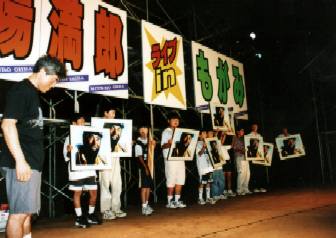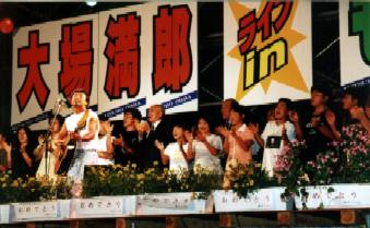 ▼八月十日、北極海単独横断の成功をたたえた記念イベント「大場満郎ライブinもがみ」が、町営野球場で開催された。折からの台風で悪天候が心配されたものの、開場時刻の午後五時を迎えると、強風がピクリとおさまった。大場さんを支援する大勢の人々の祈りが、天に通じたのかもしれない。入場者も町内外から続々とつめかけ、あっという間に四千人近い人々で会場がふくれ上がった。この日は開演に先立ち、いくつかのアトラクションが披露された。トップバッターは、本町出身の演歌歌手・須賀ゆう子さん。須賀さんは、大場さんの晴れ舞台に華を添えたいと、急きょ出演が決定。定評のある素晴らしい歌唱力で場内を魅了した。続いて、総勢百二十人の大人数で出演いただいた最上町音頭保存会による舞踊。そしてアトラクションの最後に、勇壮な太鼓の響きを場内にとどろかせてくれた富山観音大鼓保存会による演奏が披露された。さあ、あとは七時の開演を待つばかり。 | |