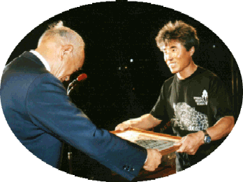 ▼第一部は、”お帰りなさいセレモニー”。はじめに、中村町長から大場さんに、「町民栄誉賞」の表彰状と記念のメダルなどが贈呈された。この賞は、学術や教育、芸術、文化、スポーツなどの分野で功績をあげた人に贈られるもので、大場さんは七人目の受賞者。このほか、最上広域市町村事務組合(理事長・高橋栄一郎新庄市長)からの「特別表彰」も行われた。 ▼続いて、今回のイベントのために特別に出演いただいた、町民栄誉賞第一回受賞者のケーシー高峰さんの発声で、会場の全員で祝福の乾杯を行い、第二部へと移った。 第二部は、百二十二日間にわたった”北極海横断”の軌跡を振り返えるコーナー。大場さんと司会者との村談やステージわきに設置された大型スクリーンに、横断の様子を記録した映像が上映されたほか、ゲストとして招待された「応援事務局」のスタッフのみなさんから、今回の成功への感想を語っていただいた。また、町内すべての小学校と最上中学校、新庄北高最上校に、大場さんのサイン入り写真パネルが贈られ、各校代表の子供たちに手渡された。 ▼第三部は、南陽市で農業を営みながら音楽活動を続けている須貝智郎さんのコンサート。「ベゴ子は山に」などのヒットソングを中心に数曲を熱唱した後、須貝さんのリードによる大合唱で、イベントの幕が降りた。 | |